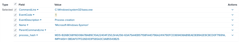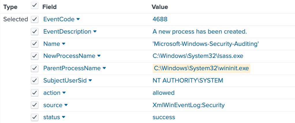 Lsass.exe may not always have a parent process (as we see on the Splunk screenshot), as it is part of core Windows system initialisation.