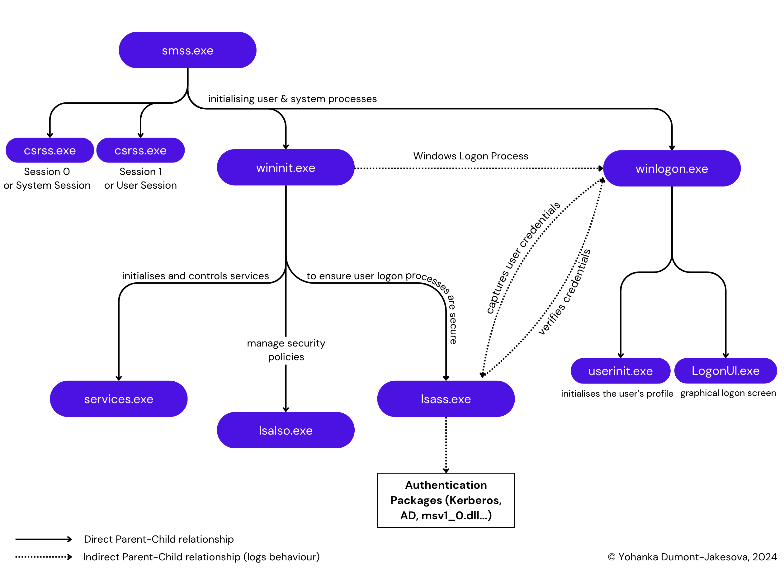 Recently, I attempted to participate in my first CTF, hosted by the DFIR Report. This experience humbled me and made me realise the knowledge gaps I have, particularly in one area: Windows processes. In this article, I document the normal behaviour of Windows authentication processes and log behaviour in Splunk. What you will read here is certainly not new, but it might serve as a helpful reference. This article is the first of a series, and is covering 4 crucial Windows processes. Since it can be confusing and hard to visualise, I’ve created a hierarchy map with parent/child relationships with its main function.